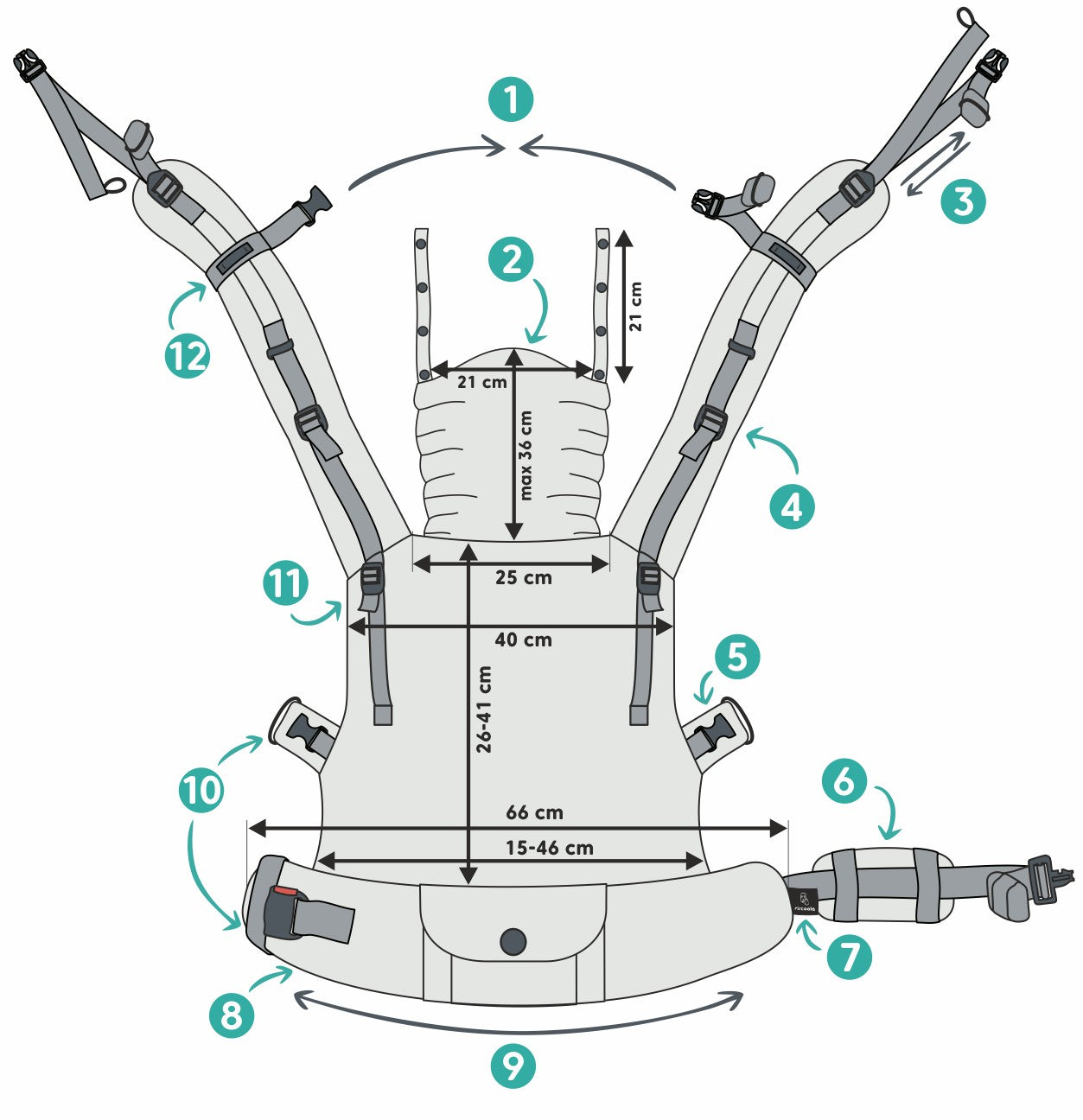 • Etichetă Circoola® NFC: atinge cu telefonul pentru a accesa manualul, tutorialul video și informațiile detaliate despre marsupiu (model, mărime, design, compoziție, greutate, dată producție, număr de serie)