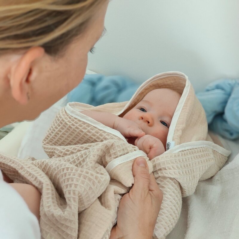 - Prosop Hug cu glugă – Se prinde în jurul gâtului înainte de baie. Ridici bebelușul în siguranță cu ambele mâini și îl apropii de tine — prosopul este deja acolo, gata să îl învelească și să îl încălzească, iar gluga moale îi protejează capul.